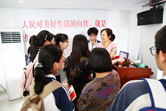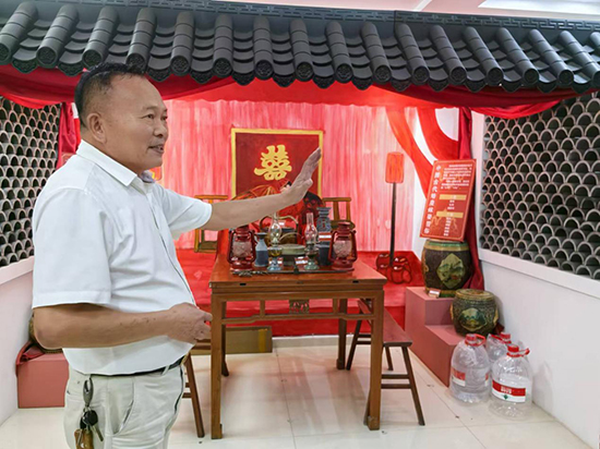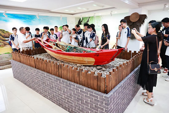 在村黨群服務(wù)中心三樓民俗文化展廳,蓑衣、石磨、風(fēng)谷車,錫燭臺、錫酒壺,一件件農(nóng)耕器具與民俗物件,讓人恍如進(jìn)入上個世紀(jì)五六十年代。看著這些屬于爺爺奶奶太公太婆那個年代的物件,同學(xué)們不由感慨萬分。鄭歲權(quán)書記向在場師生詳細(xì)介紹凰嶼村的三大寶——漁船、陶瓷、餛飩擔(dān)。鄭書記侃侃而談,如數(shù)家珍,師生們聽得津津有味,對上一輩人艱苦創(chuàng)業(yè)的精神充滿了敬佩。