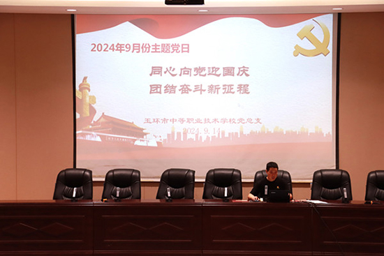 9月14日下午,玉環市中等職業技術學校黨總支在學校A系部樓階梯教室舉行以“同心向黨迎國慶,團結奮斗新征程”為主題的9月份主題黨日活動。會議由校黨總支書記張昌森主持。