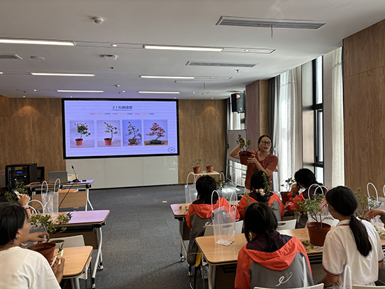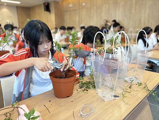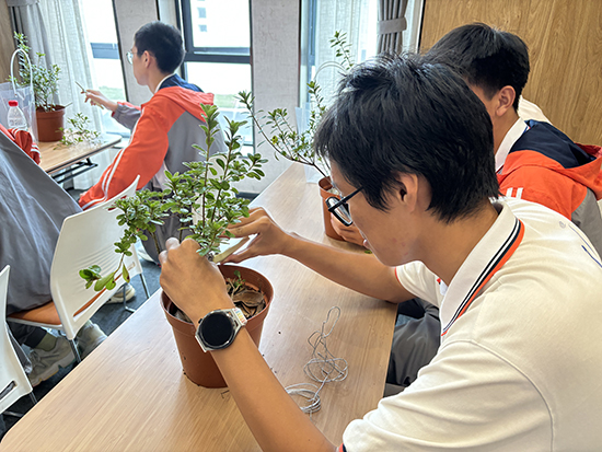 同學(xué)們走進碧云花園,跟著杜鵑花造型藝術(shù)非遺傳承人蔡海燕,學(xué)習(xí)設(shè)計杜鵑花造型。蔡老師講解并示范了杜鵑花造型技巧,從修剪到蟠扎,每一個步驟都充滿了匠心獨運。同學(xué)們專心致志聽講,紛紛動手實踐。