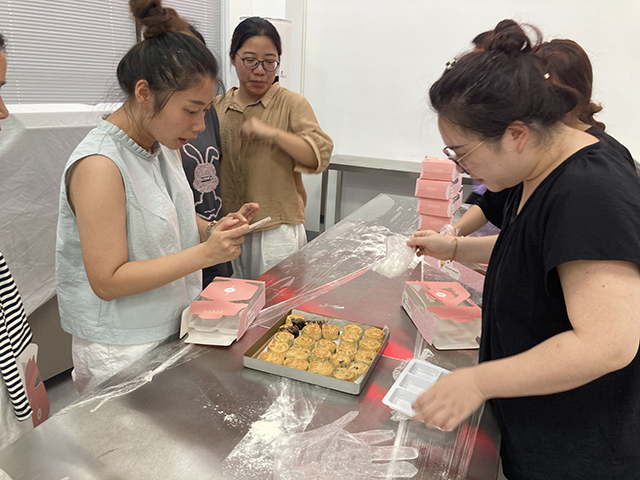 活動(dòng)現(xiàn)場(chǎng),幼兒老師們站在操作臺(tái)兩邊,四人一組。楊晹老師介紹了“廣式”月餅的制作過(guò)程,并為每組學(xué)員分發(fā)了餅皮、餡料、月餅?zāi)>叩人璧牟牧?。大家一起揉皮、加餡料、包月餅、(放入模具)按壓成型,再逐一上色、烘烤。幼兒老師們歡聲笑語(yǔ),一邊相互探討著做法。經(jīng)過(guò)一個(gè)多小時(shí)的勞動(dòng),一個(gè)個(gè)晶瑩剔透的廣式月餅完成了。金黃色的月餅擺放在操作臺(tái)上,大家看著親手制作的廣式月餅,紛紛表示“第一次做廣式月餅,開(kāi)心啊”“自己做的月餅不油膩,好吃”。