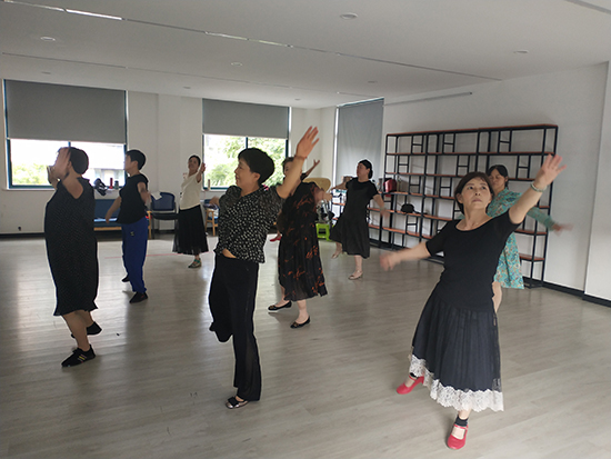 在楊蘭芳老師的帶領下,老年舞蹈班的學員們首先進行了每課必備的拉伸運動,為接下來的舞蹈學習做好準備。隨后,楊老師教授了一支富有意義的舞蹈——《五星紅旗》。