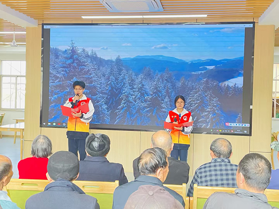 上午9:40,隨著一陣陣清脆的朗誦聲響起,同學(xué)們以飽滿的熱情朗誦了《美麗中國》,字字句句間流露出對祖國大好河山的熱愛與贊美,不僅讓在場的老人感受到了祖國的繁榮昌盛,也激發(fā)了年輕一代對建設(shè)更加美麗中國的憧憬與決心。緊接著,一曲《我愛你中國》由22師資班王詠琪深情演唱,歌聲悠揚(yáng),情感真摯,瞬間拉近了與老人之間的距離,讓整個(gè)養(yǎng)老服務(wù)中心洋溢著濃厚的節(jié)日氛圍。