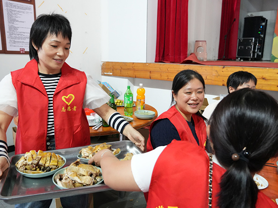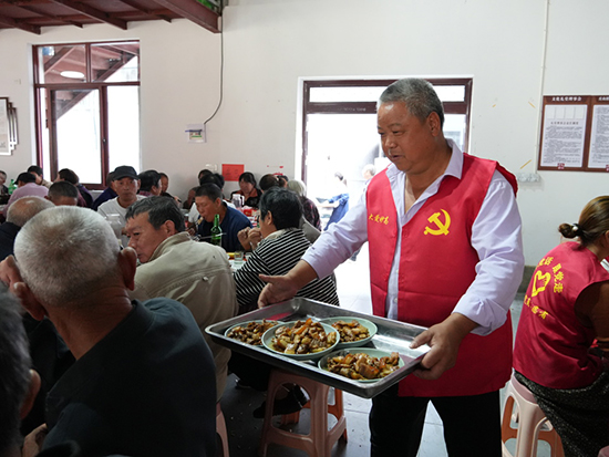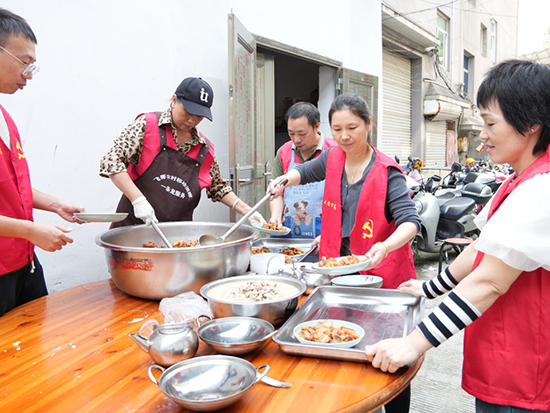 而在同一時間的文化禮堂外,只見三口大鐵鍋同時開工。洗菜、切菜、烹煮……在現場,參與桌宴置辦的遂昌縣成技校黨員志愿者們正忙得不可開交。