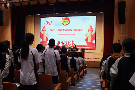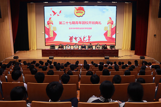 10月11日中午,玉環市中等職業技術學校在學校大報告廳舉行第二十七期青年團校開班典禮,學校副校長金松,輔導員汪光岳、王金偉、董志華、蔡其標以及團委書記袁安出席,342名學員參加,活動由團委副書記林旭環主持。