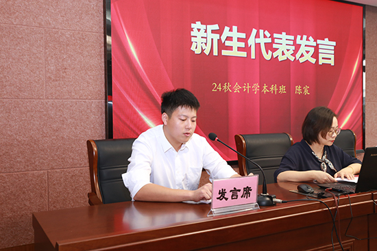 新生代表、24秋會計(jì)學(xué)本科班學(xué)員陳宸作了表態(tài)發(fā)言。他號召同學(xué)們盡快融入開大,做好學(xué)習(xí)規(guī)劃,積極參加活動,干出新成績,用行動為學(xué)習(xí)型社會建設(shè)貢獻(xiàn)開大學(xué)子的力量。