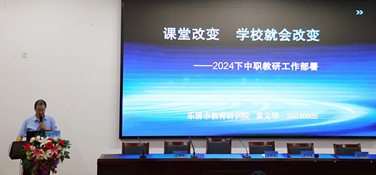 樂清市教育研究培訓(xùn)院副院長黃文華以《課堂改變 學(xué)校就會改變》為主題,強(qiáng)調(diào)教研工作的核心需緊密圍繞堅(jiān)持素養(yǎng)導(dǎo)向。要求與會各校領(lǐng)導(dǎo)與各學(xué)科組長通過改進(jìn)課堂教學(xué)、加強(qiáng)專業(yè)建設(shè),促進(jìn)中職高質(zhì)量發(fā)展,并部署2024下半年中職教研工作。