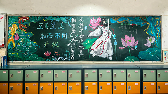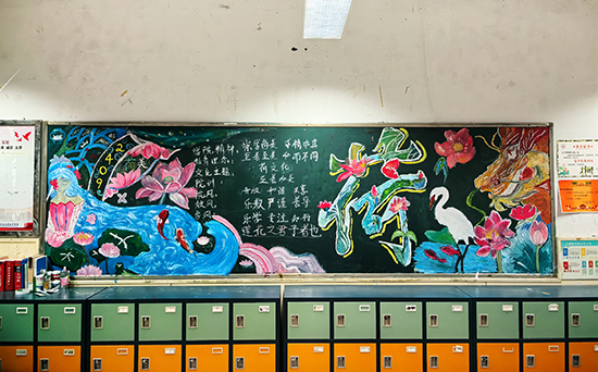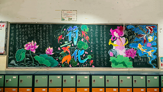 黑板報(bào)上,有的用淡雅的水墨畫描繪出荷花的高潔姿態(tài),有的以優(yōu)美的文字闡述荷文化的深刻內(nèi)涵,還有的用創(chuàng)意的排版將與荷有關(guān)的詩詞、故事巧妙融合。
