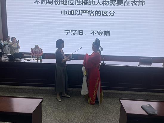 在講座中,李女士揭示了戲曲服裝制作的精細(xì)工藝。她介紹了戲服的面料選擇,如何根據(jù)不同角色的身份和性格挑選適合的絲綢、緞子等材質(zhì);講解了戲服上的刺繡工藝,還分享了戲服的裁剪和縫制技巧。講座的最后,同學(xué)們親自體驗(yàn)了戲服的穿戴,感受了從選材到成品過(guò)程中每一道工序的匠心獨(dú)運(yùn),深刻體會(huì)到了這一傳統(tǒng)技藝的魅力所在。這次體驗(yàn)不僅為同學(xué)們打開(kāi)了了解非遺文化的大門(mén),也在他們心中埋下了傳承和發(fā)揚(yáng)這一技藝的種子。