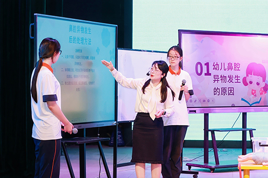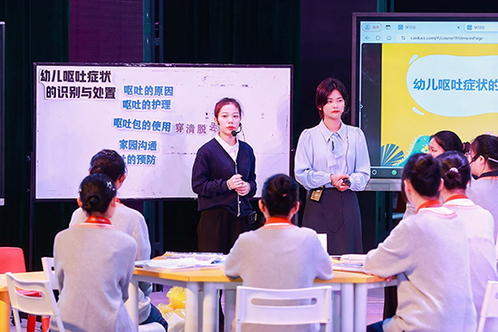 在“賽教融合課堂”觀摩環(huán)節(jié),浙江省湖州藝術(shù)與設(shè)計(jì)學(xué)校的王云老師和企業(yè)導(dǎo)師曲海靜以雙師共導(dǎo)的形式開設(shè)了一堂《幼兒嘔吐癥狀的識(shí)別與處置》,寧海縣第一職業(yè)中學(xué)的胡虹燕老師則帶來(lái)了《幼兒常見意外傷害及其處理之異物入體傷害及處理》公開課。兩堂公開課亮點(diǎn)紛呈,教學(xué)方法兼具創(chuàng)新性與實(shí)用性。隨后,聽課教師就數(shù)字教學(xué)平臺(tái)和AI技術(shù)在教學(xué)的應(yīng)用展開深入研討。