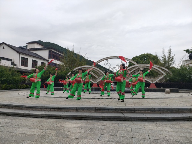 “咚鏘 咚鏘 咚咚鏘”在鄣吳村八府廣場經常可以看到一支腰系紅綢緞的腰鼓隊不斷變換著隊形,熱情洋溢的敲打著腰鼓。這是安吉社區教育學院天子湖分院鄣吳鎮老年學校的學員們在進行腰鼓訓練。