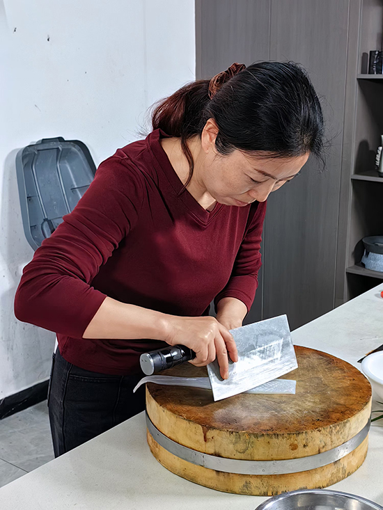 安吉技師學院的馬貴老師首先為學員們講解并示范了直、平、斜、剞四大刀法。每一種刀法都被馬老師詮釋得精準而生動,仿佛手中的刀具是一支神奇的畫筆,能在食材上勾勒出最美的線條。蘿卜片在老師的快刀下,瞬間變得均勻而薄透,好似透明的花瓣;雞和魚在分檔取料的過程中,被馬老師巧妙地分解,每一塊都恰到好處;花刀魷魚片更是令人驚嘆,那精美的紋路仿佛是藝術品。