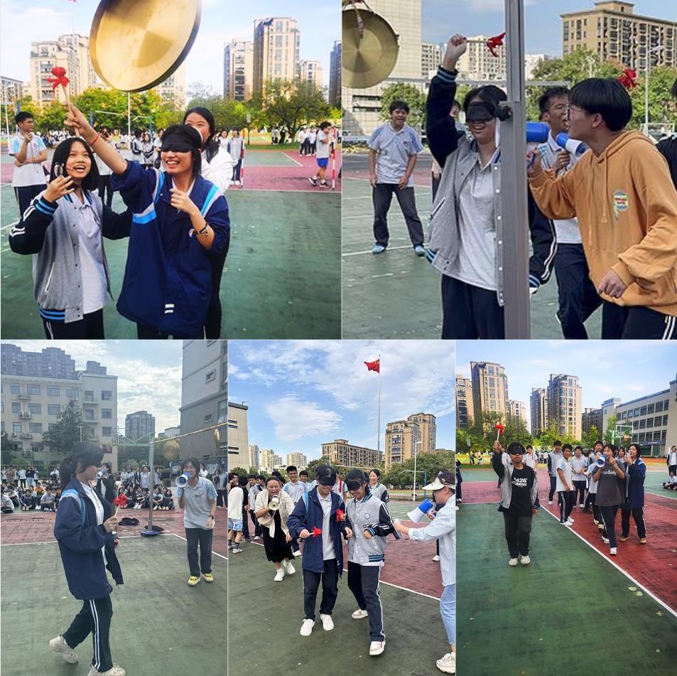 為給高三學生適當地釋放學習壓力,促進同學間的交流互助,增強班級凝聚力,日前,杭州市臨平商貿職業高級中學高三學生在操場上進行了一場別開生面的趣味活動,本次活動主要包括蒙眼敲鑼和足球定點射門兩項。