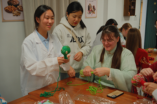 在中藥實訓(xùn)室,國潮魅力令外國友人深深著迷。在中藥專業(yè)老師和學(xué)生志愿者的帶領(lǐng)下,大家興致勃勃地親手制作艾草養(yǎng)生錘,感受中醫(yī)“神秘療法”;觀摩學(xué)生茶藝表演,品養(yǎng)生茶飲,沉浸式體驗中國茶藝之美。第一次喝到中國白茶,Eemil忍不住感慨:“Unique,very good!”