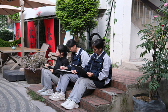 出發前曹老師細致指導,學生帶著作畫工具,滿懷期待地走進新市古鎮。學生們各自尋找心儀地點,選取角度,開始構圖作畫。