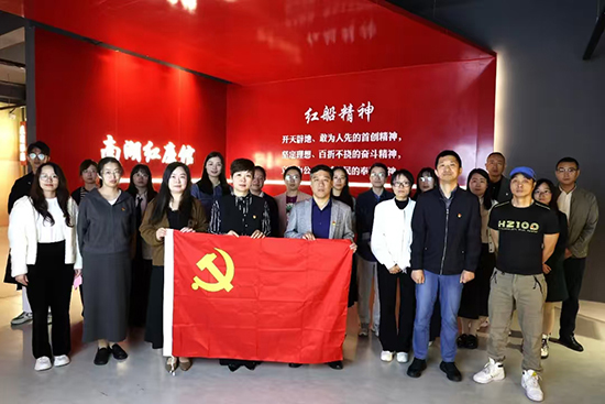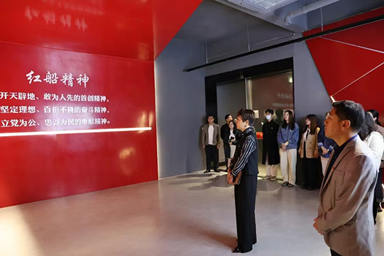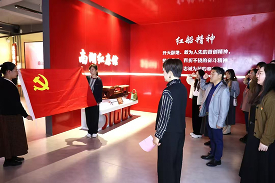 在前廳的紅船模型前,范曉春帶領黨員教師們重溫入黨誓詞。范曉春領誓,兩位黨員教師手舉黨旗,全體黨員高舉右拳,莊嚴宣誓。
