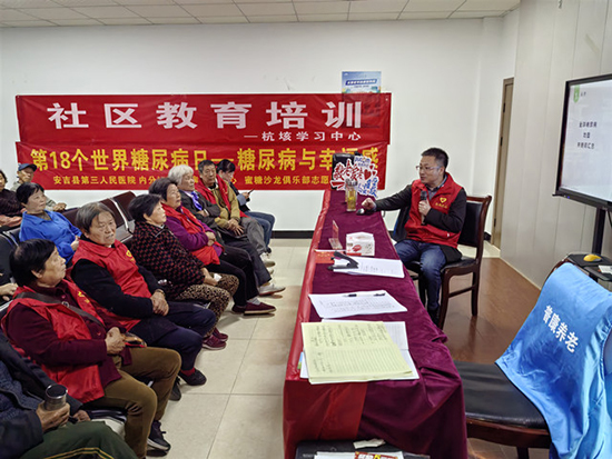 11月14日是世界糖尿病日,為普及居民尤其是老年朋友對糖尿病疾病的認識以及如何正確預防糖尿病知識,提升居民健康生活,安吉縣社區學院杭垓學習中心特邀安吉三院朱冰副主任醫師于11月14日上午在磻溪老年學堂開展了糖尿病防治健康知識講座,講座主題是《糖尿病,只“治”不“管”,結果越治越慌》,此次活動有50余位來自轄區的中老年朋友參加。