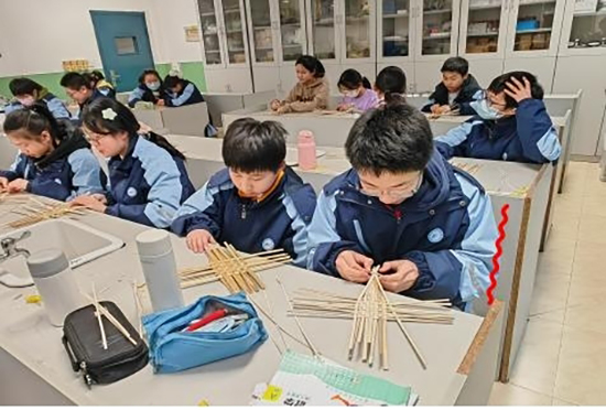同年,隨著我們的工匠師資隊伍日益壯大,“行走的工匠”項目又開啟了“雙減”背景下助力課后教育生態重塑的探索。一方面充分挖掘區域內外社區教育和職業教育資源,面向青少年創新開發包括非遺技藝、傳統手工技藝和本地傳統文化的“匠美”系列課程,旨在通過“云上行”和“線下走”兩種服務形式,充實學校課后服務“1+X”的“X”課程,參與德育、美育、勞育等方面的培養,提升孩子們的綜合素養和傳承中華傳統文化,緩減學校、教師的教學和管理壓力。另一方面,陸續開設“行走的工匠”進校園系列體驗課程:與浙江廣播電視報刊出版總社合作開發“行走的工匠·走進非遺感知宋韻”系列活動,將土布紡織技藝、傳統面塑、宮廷杭繡等非遺課程開進青藍小學、澎博小學等校園;與武林之光非遺技藝傳習中心合作,在杭州市春蕾中學建立傳統文化非遺社團,開設了手鞠、衍紙、草編、冷瓷等8門工匠技藝學習體驗課程,中學生參與“工匠進校園”社團學習年均800余人次,“其實我一直都對傳統手工感興趣的,只是沒有機會,也沒有途徑,現在學校里開了非遺技藝社團,很多工匠進校園來教我們學習這些手工藝,還有享學拱墅小程序上有直播課回放,可以幫我們復習,我很喜歡。”七年級的李航同學說,他是社團里同學們眼中工匠技藝傳習的“學霸”。從近幾個學期工匠技藝傳習社團招募中,每次報名的學員均有10%左右增長的情況來看,如今熱愛工匠文化的學生越來越多,家長們也非常支持孩子學一門自己喜歡的手藝。第三方面,項目團隊與6所校園合作建立起“行走的工匠”校園傳習基地,結合手工藝品制作和培訓,打造了一批青少年第二課堂活動、實踐基地。如“校園女紅文化+”模式,以校方為主導,在校園中建立女紅體驗教室或女紅體驗館,學生線下體驗,家長通過線上直播學習,雙管齊下,助推工匠文化和技藝的定向傳承和中小學生的職業啟蒙。