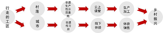 我們的工匠行走在村落和城市之間,在村落建設非遺生產性示范基地,在城市開辟非遺傳習所,通過云上課堂和線下體驗相結合的方式,由村落的手藝人生產加工原材料體驗包,在城市開展體驗銷售,現已建有10個合作社24個民族手工藝品生產直播課,并納入包括上海、江蘇、安徽、浙江四省六地的長三角云視課堂,實現教學資源共享,“行走的工匠”項目進一步擴大了教育的覆蓋面和受眾面。