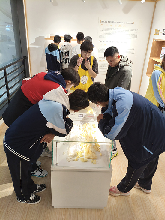 隨后來到海寧市中小學研學實踐中心。在小云龍蠶桑樂園基地輔導員老師的帶領下,同學們走進規模化蠶桑基地的現代化蠶房,親身體驗數字化養蠶的魅力。在500畝桑樹園內,同學們細心挑選采摘桑葉,為蠶寶寶準備最為鮮嫩的口糧。