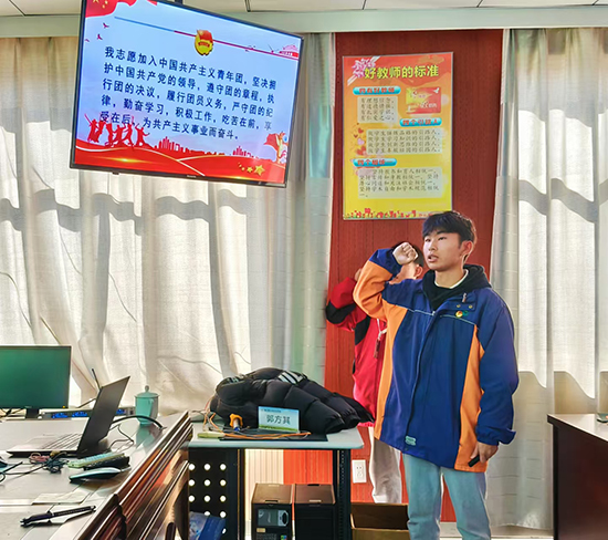 領誓人帶領新團員進行入團宣誓。全體團員緊握右拳,舉起過肩,一同在團旗下宣誓,正式加入中國共產主義青年團,踏上了奮斗新征程。