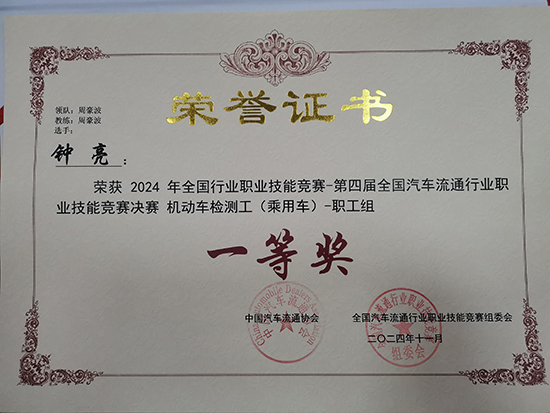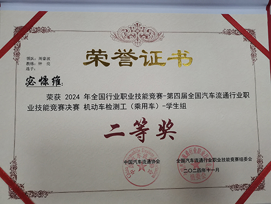 在機(jī)動(dòng)車(chē)檢測(cè)工(乘用車(chē))總決賽中,鐘亮老師榮獲機(jī)動(dòng)車(chē)檢測(cè)工(乘用車(chē))職工組一等獎(jiǎng),由鐘亮老師指導(dǎo)的22汽修大專(zhuān)宓慷維同學(xué)榮獲機(jī)動(dòng)車(chē)檢測(cè)工(乘用車(chē))學(xué)生組二等獎(jiǎng),周豪波老師被評(píng)為機(jī)動(dòng)車(chē)檢測(cè)工(乘用車(chē))職工組優(yōu)秀教練。