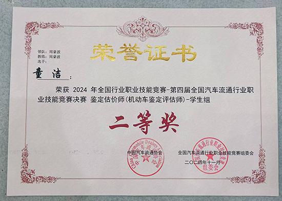 在鑒定評(píng)估師(機(jī)動(dòng)車(chē)鑒定評(píng)估師)總決賽中,由周豪波老師指導(dǎo)的22汽修班童潔同學(xué)榮獲全國(guó)二等獎(jiǎng);由李剡涢老師指導(dǎo)的23汽車(chē)營(yíng)銷(xiāo)班廖瑩同學(xué)榮獲全國(guó)三等獎(jiǎng)。