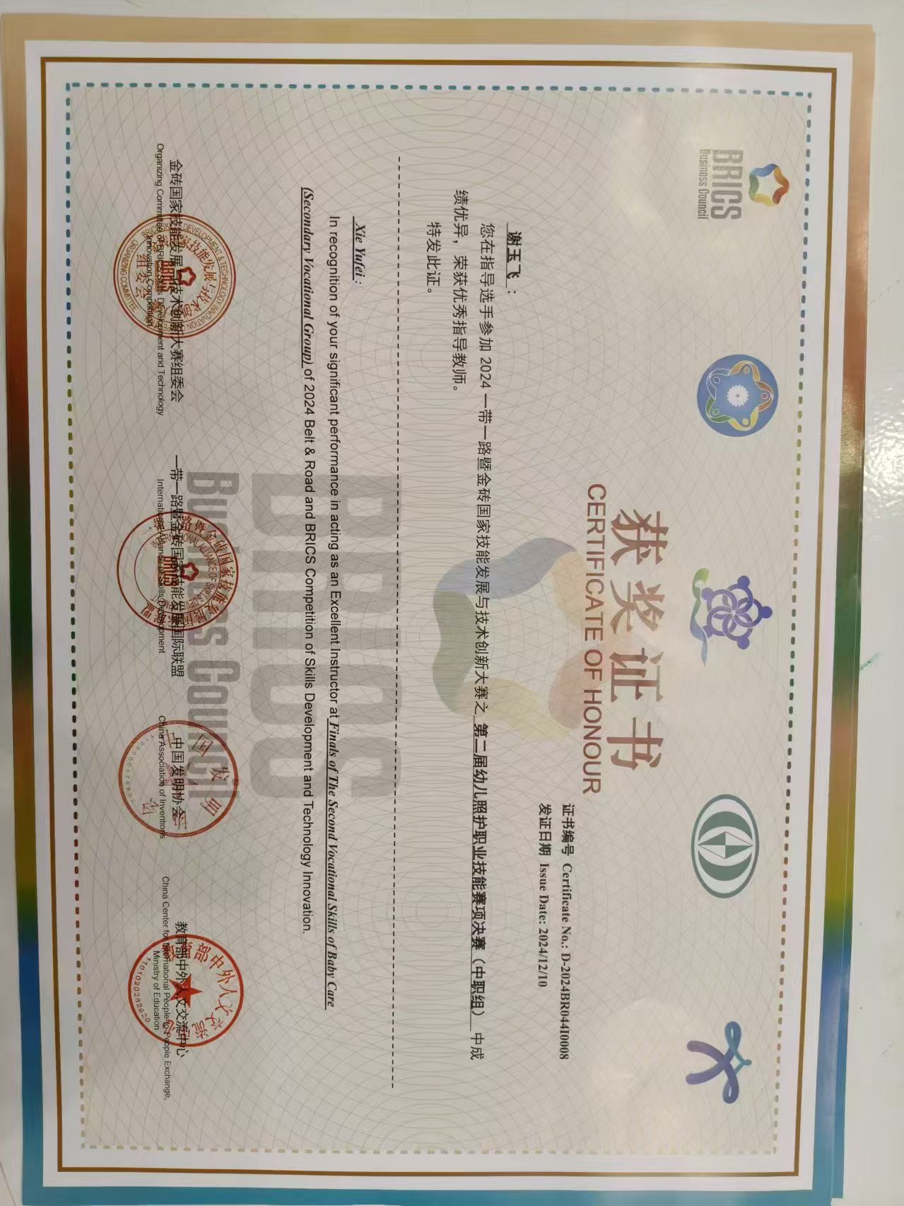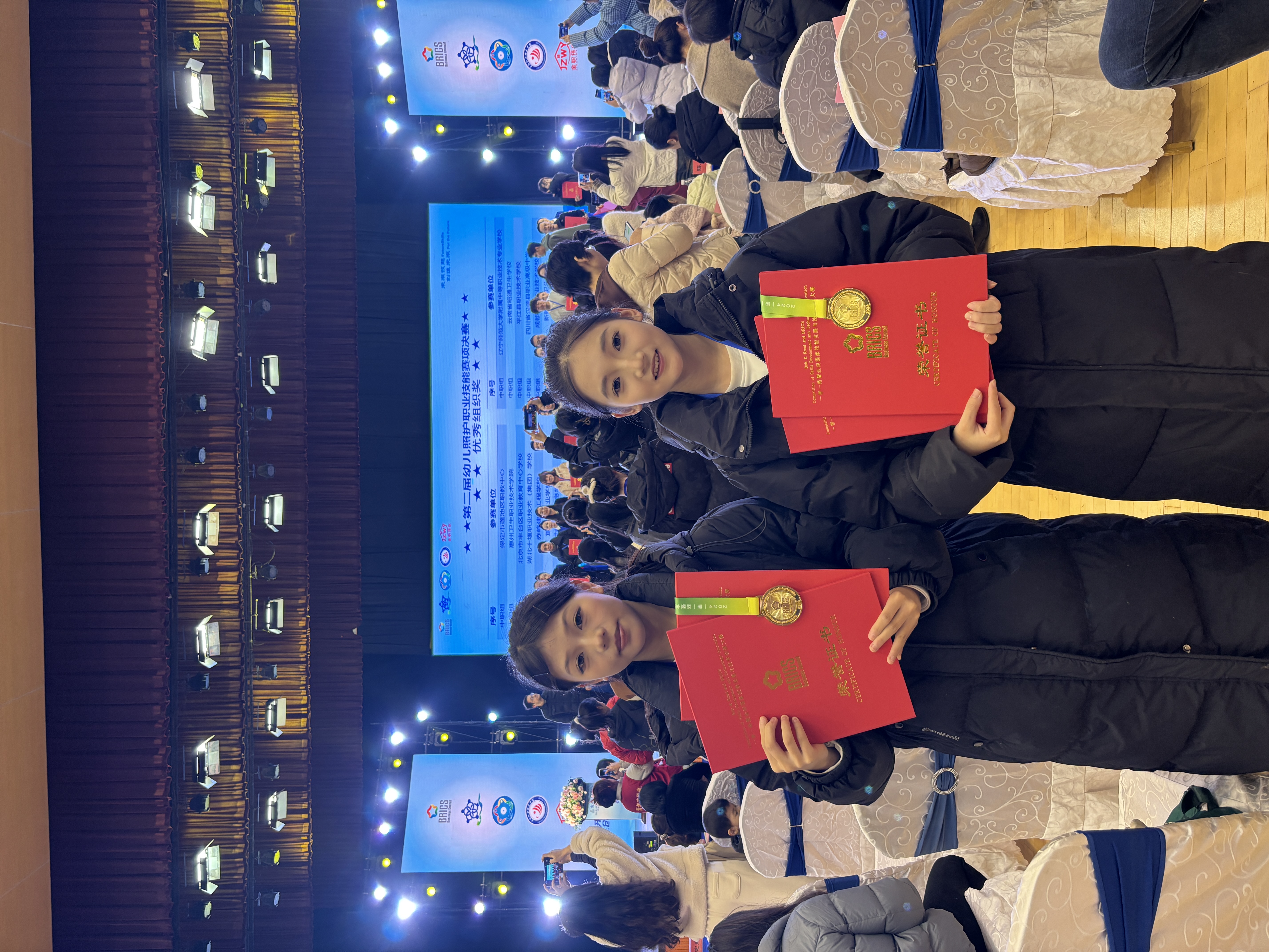 12月10日,2024年一帶一路暨金磚國家技能發展與技術創新大賽第二屆幼兒照護賽項決賽成績公布,嵊州市職教中心23保育大專班竇唯婭、周慧芳兩位同學組成的團隊成功斬獲全國一等獎,并將獲得1+X幼兒照護高級證書;竺婷蘭、謝玉飛被評為優秀指導教師;嵊州市職教中心獲“最佳組織獎”。