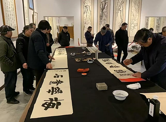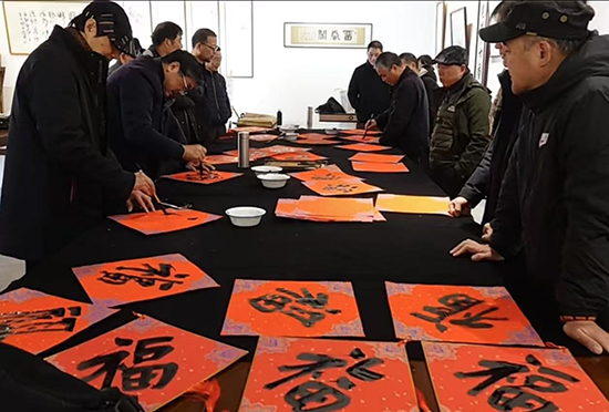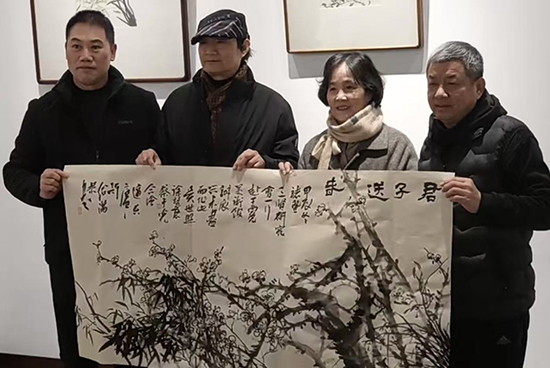 成員們現(xiàn)場進(jìn)行了創(chuàng)作,每位信手書寫了各種書體的“福”字,不一會兒,桌子上與地上攤滿了一張張紅紙黑字的遒勁有力“福”,真是百“福”迎門。有的趁興還寫下了條幅與對聯(lián),楓江書畫社社長魏仁虎就寫了“翰墨千秋”的條幅。更值得一提是,浙江省國畫家協(xié)會會員、紹興市美術(shù)家協(xié)會會員、諸暨市美術(shù)家協(xié)會理事徐慧君,紹興市美術(shù)家協(xié)會理事、諸暨市美術(shù)家協(xié)會秘書長、諸暨市文化館畫院特聘畫師、筆峰書畫院副院長吳世照,諸暨市美術(shù)家協(xié)會會員、諸暨三賢研究會會員、筆峰書畫院會員蔡于光三人聯(lián)袂畫了《君子送春》圖,諸暨市書法家協(xié)會原主席、諸暨市三賢研究會會長許紹滿專門作了題跋。四位當(dāng)?shù)貢嫶蠹夜餐瑒?chuàng)作一幅作品,留下了諸暨書畫界的佳話。