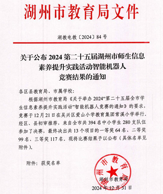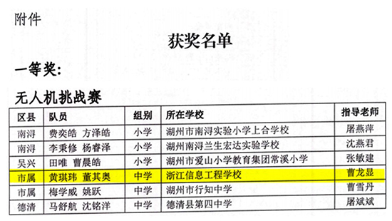 2024年12月21日,由湖州市教育局主辦的湖州市師生信息素養(yǎng)提升實(shí)踐活動(dòng)智能機(jī)器人競(jìng)賽,在愛(ài)山小學(xué)教育集團(tuán)常溪小學(xué)圓滿落幕。浙江信息工程學(xué)校駝群創(chuàng)智空間工作室派出的兩支精英代表隊(duì)在無(wú)人機(jī)編程挑戰(zhàn)賽中,分別榮獲中學(xué)組一等獎(jiǎng)(第一名)和二等獎(jiǎng)。