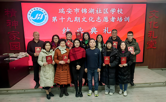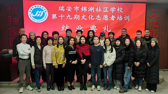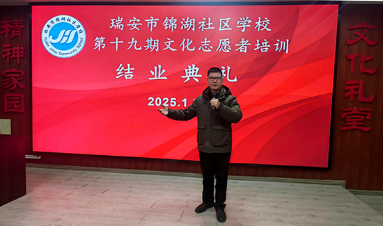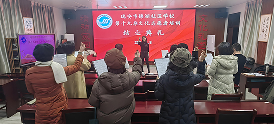 1月8日晚,瑞安市錦湖社區(qū)學(xué)校的文化禮堂沉浸在一片歡歌笑語之中,第十九期文化志愿者培訓(xùn)班的結(jié)業(yè)典禮在這里盛大舉行。禮堂內(nèi),悠揚的歌聲如同精靈般跳躍,為現(xiàn)場營造出熱烈而溫馨的氛圍。