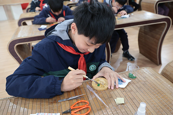 在活動進程中,嘉興市建筑工業學校的掐絲琺瑯畫指導教師梅賢俊,細致入微地向師生們闡述了掐絲琺瑯畫的歷史底蘊、精湛工藝及所需材料工具,將制作精髓娓娓道來。隨后,實踐環節拉開帷幕,無論是教師還是孩子們,都滿懷熱情地投入到制作中。他們或凝神勾勒線條,筆觸間透露出專注與細膩;或細致入微地鑲嵌金絲,每一個動作都彰顯著匠心與毅力。即便長時間低頭致脖頸酸痛,他們也未曾有過一絲放棄的念頭。尤為令人動容的是點藍步驟,孩子們的小手因緊張而微微顫抖,生怕一個不慎破壞了整幅作品的和諧。當六年級的小朋友們滿懷自豪地欣賞著自己親手制作的作品時,非遺文化的韻味與孩子們純真的笑臉交相輝映,共同繪制出一幅既古老又充滿生機的美麗圖景,讓這次活動成為了一次難忘的文化傳承之旅。