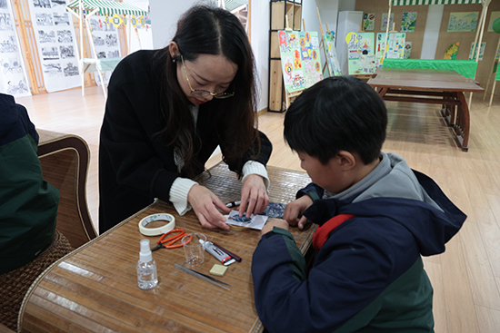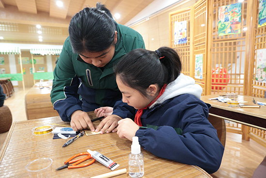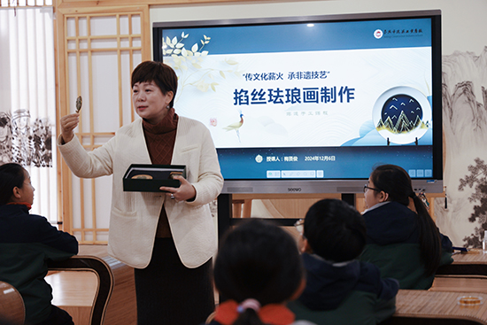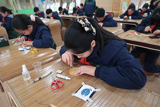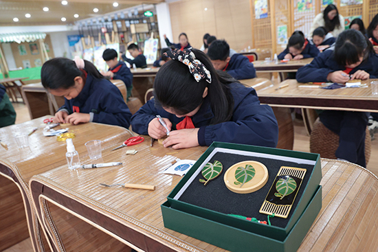 嘉興市建筑工業學校將自身的特色選修課程——掐絲琺瑯畫,引入小學教育中。并巧妙地將掐絲琺瑯畫技藝與茶園小學的辦學理念相結合,以該校獨特的校標LOGO為創意源泉,引導小學生們親手制作富含學校特色的掐絲琺瑯畫杯墊、書簽及冰箱貼。這一活動不僅讓學生們在實踐中領略到了傳統文化的魅力,更增強了他們對學校文化的認同感和歸屬感。