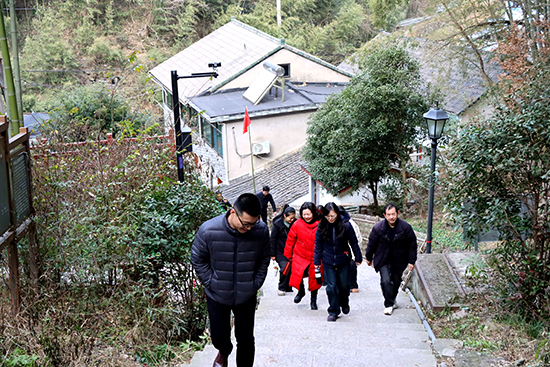 基層學校走訪調研結束后,大家來到位于夏履鎮雙葉村海拔400余米的葉家山腳下。大家相互鼓勁,穿過幽靜竹林,登上1046步臺階,來到被譽為夏履十二景之一“山隱桃源”的葉家山古村落。徜徉在古村落八百年悠久歷史之中,千年古柏在美麗冬景的映襯下顯得更加蒼老,仿佛向大家敘說著古村落這段不朽古老傳說。