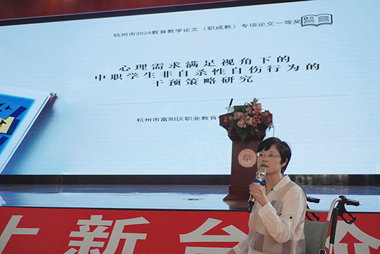 緊接著,杭州市一等獎論文獲得者張文竹老師上臺分享。張老師從工作實際出發,深入剖析了論文主題的確立過程及寫作思路。