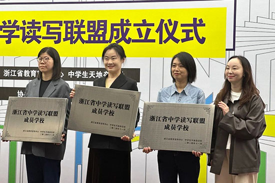 成立儀式上,副校長朱曉慧作為學校代表領取“浙江省中學讀寫聯(lián)盟成員學校”銅牌,學生處處長楊育萍領取浙江省中學讀寫聯(lián)盟頒發(fā)的指導師聘書。