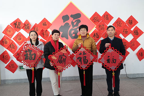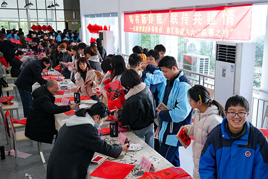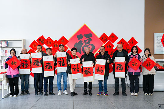 校黨委書記范曉春與硯邊歲月書法社骨干成員徐新奇、鄭強勝、蔣雪揚、許韜等共同參與,特邀學校黨建共同體單位嘉興大學建工學院黨委書記童勇軍以及國家級工藝美術大師童人杰,省書協(xié)會員柴林根、江軍和塘匯街道人大工委主任張玨一行來校,共同參與寫福送春聯(lián)活動,現(xiàn)場洋溢著一派其樂融融、福氣滿滿的祥和氛圍。