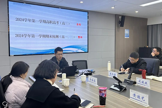 在會議第三項議程中,蔡際鈞對上學期各校高三高職高考班聯考情況進行了分析解讀。他提出,各校應關注專業發展、關注臨界生的個性輔導、充分研讀語數課標,并及時開展16個專業考綱的內研外培,通過找突破、調專業、選苗子,實現各專業本科率的穩步提升。隨后,蔡主任圍繞上學期高一、高二期末統測情況,通過關鍵名次、ABC檔增量、學科平均位次、A檔學科偏離情況等多個指標在全市層面進行了詳實的分析。他強調,數據分析的本質是需要深挖數據背后的問題,建議各校按“班級—學科—教師—學生”的思路逐級深入分析,再根據班級情況制定教學策略,有的放矢地開展各項舉措。蔡主任提出了做分析、明導向、抓落實三點工作建議,并針對新學期重點工作進行了布置。