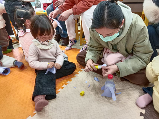 隨后,養(yǎng)育指導(dǎo)員拿出彩紙,引導(dǎo)孩子們用小手撕出不同的形狀,為“瓶寶寶”穿上漂亮的衣服、戴上可愛的帽子。孩子們充分發(fā)揮想象力,有的將彩紙撕成小塊,有的撕成長條,在家長的協(xié)助下,將彩紙粘貼在瓶身上,創(chuàng)作出獨(dú)一無二的“瓶寶寶”造型。