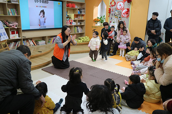 活動伊始,家庭養(yǎng)育健康指導(dǎo)員以“我們的小手能做什么?”為引,引導(dǎo)孩子們積極思考,“吃飯”“穿衣”……孩子們爭先恐后地舉手回答,現(xiàn)場氣氛熱烈。隨后,伴隨著歡快的《小手拍拍》兒歌,孩子們或揮舞小手、或藏起小手、或拍拍小手,在律動中感受著小手的靈活與力量。