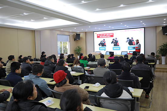 本次救護員培訓采用線上與線下相結合的方式進行。在此之前,村民們已在家中通過線上視頻完成了初步學習。線下培訓當天,昌碩分院特聘教師丁柏偉首先為村民們進行了集中理論課教學。丁老師詳細講解了氣道異物梗阻和心肺復蘇兩大急救知識,為村民們打下堅實的理論基礎。