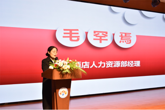 臨平大酒店經理毛罕焉作為企業代表上臺發言,她詳細介紹了酒店的企業文化、發展歷程以及對人才培養的重視,并對即將進入崗位實踐的學生們提出了殷切期望。毛經理表示,企業將為學生們提供優質的實踐平臺,幫助他們將理論知識與實際操作相結合,助力他們成長為行業中的優秀人才。