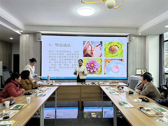 活動現場,馮禮老師首先將準備好的食材和工具分發給學員們,并詳細介紹了各種工具的名稱和用途。當得知制作面團的白蕓豆粉可直接食用時,學員們流露出新奇與期待的神情。在示范環節,學員們目不轉睛地看著老師的每一個動作,隨后迫不及待地動手實踐。只見一個個面團在學員們的手中,經過揉、捏、搓、壓等多道工序,逐漸變幻成一朵朵嬌艷的紅梅和雅致的玉簪花,大家紛紛表示這是一次特別的體驗。