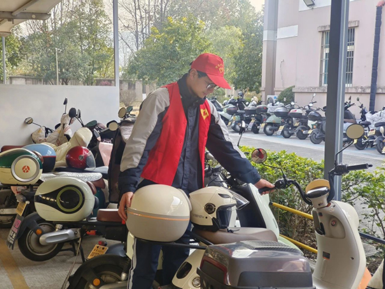 志愿者們的那一件件紅背心在陽光下顯得格外耀眼,如同一抹亮麗的“中國紅”。他們來到電動車和自行車車棚,對不規范停放的車輛進行有序整理,讓車子“歸位”,讓校園文明“到位”。