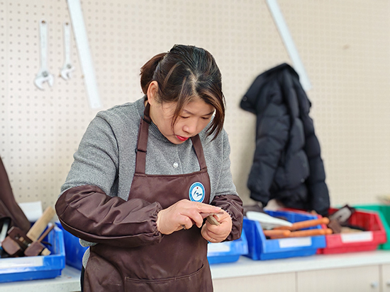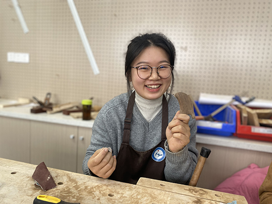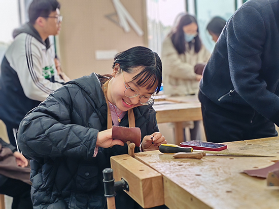 在木工坊內,女教職工們熱情高漲,全身心投入到手工制作中?;顒右潦?,木工專業的老師和學生們為她們講解了制作按摩梳的步驟和要點。隨后,大家便開始了精心的創作。首先,她們拿起戳刀,小心翼翼地將木梳的棱角磨平,確保每一個細節都處理得恰到好處。接著,用砂紙進行反復打磨,使木梳表面變得光滑細膩。最后,為木梳上蠟,增添光澤與質感,一把把精美的按摩梳在她們的巧手中逐漸成型。