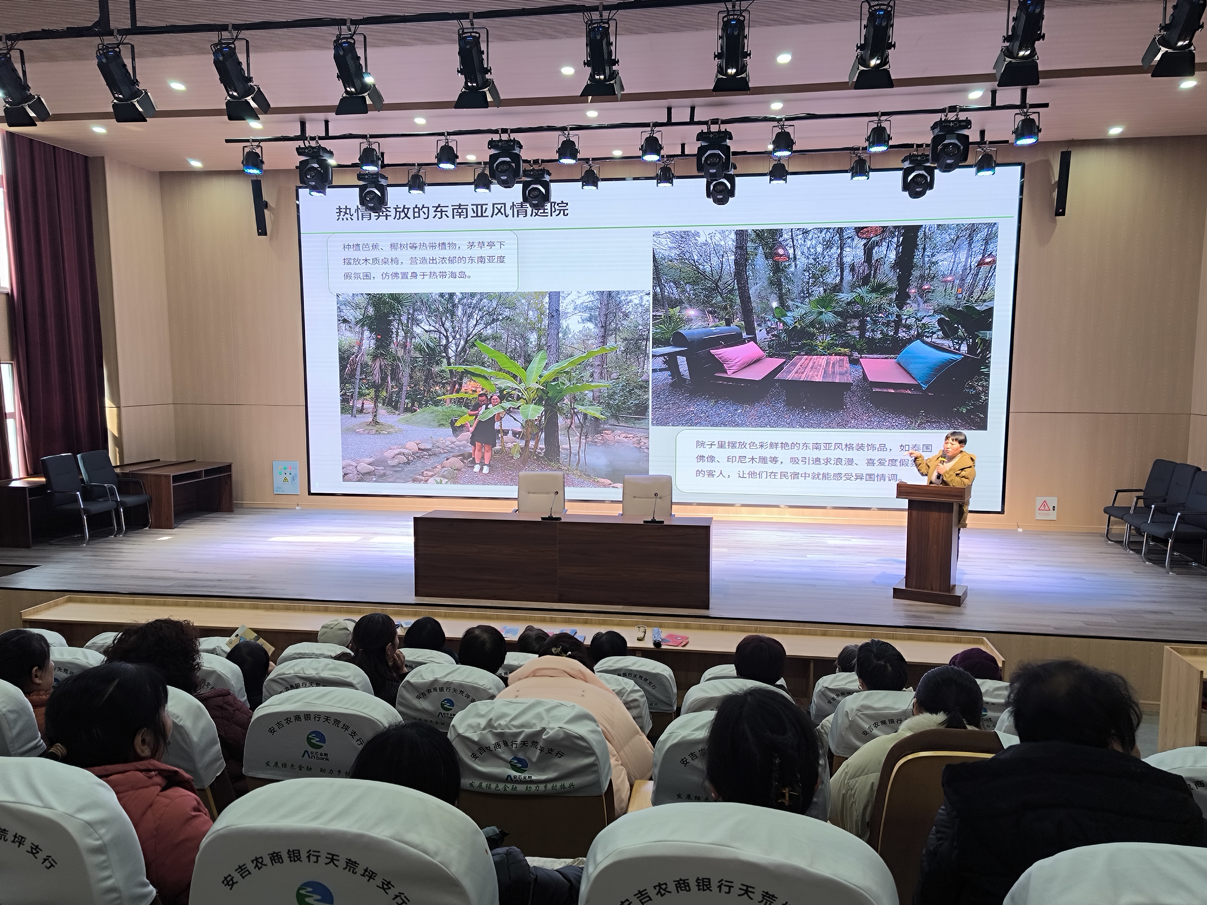 培訓首環節聚焦家庭庭院美化。活動緊扣“美化庭院·幸福生活”主題,設計了“園藝知識講堂”“創意微景觀制作”“庭院改造案例分享”三大板塊。成校特邀安吉家興園林綠化有限公司負責人、高級園林工程師自健仙女士,系統講解庭院規劃、綠植養護、色彩搭配等知識,特別針對農村庭院特點,從綠植搭配、空間布局、廢舊物品改造等方面進行講解,傳授低成本改造技巧。