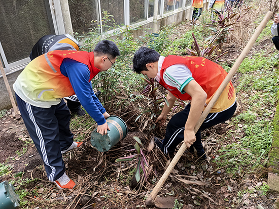 活動現場,身著紅馬甲的志愿者們分工協作,揮鍬鏟土、扶苗培土、提水澆灌,在園林專業教師指導下種植了20余株三角梅和紫背竹芋。熱烈奔放的三角梅與葉片斑斕的紫背竹芋相互映襯,為場館外立面勾勒出生機盎然的生態景觀帶。