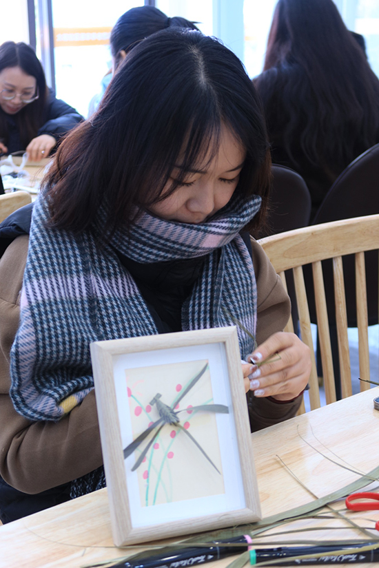 當天下午,太和社區活動室內棕葉翻飛,笑語盈盈。非遺手藝人周增方老師借助ppt,深入淺出地向大家介紹了棕編藝術,然后,手持半干棕櫚葉邊講解邊示范傳統編織技藝。學員們邊聽講解邊跟著周老師手指翻飛。漸漸地,葉片在交疊穿插中逐漸顯形,一只只活靈活現的“小昆蟲”便誕生了。