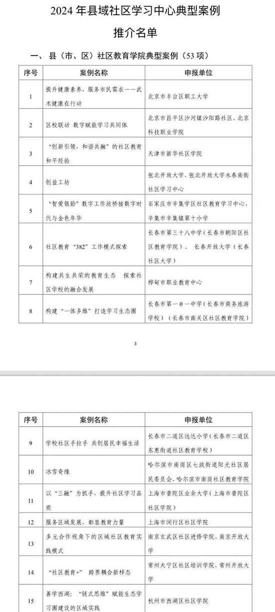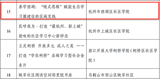 日前,教育部印發了《關于推介2024年縣域社區學習中心典型案例和社區教育品牌課程的通知》,全國共有53項縣(市、區)社區教育學院申報典型案例獲獎!其中,西湖區社區學院申報的《善學西湖:“鏈式思維”賦能生態學習圈建設的區域實踐》榜上有名!