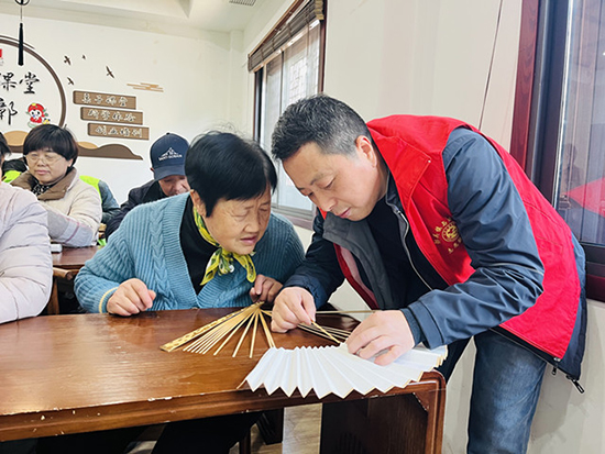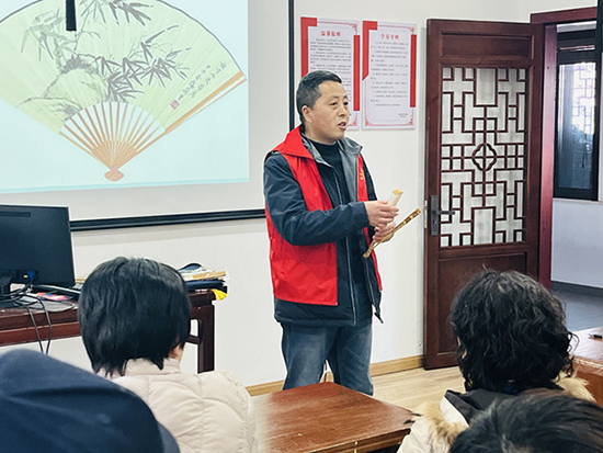活動現(xiàn)場,查道鵬老師手持竹制扇骨,邊示范邊講解:“扇面制作講究‘三分穿七分繡’,每一針都要沿著竹絲紋理走線。”學(xué)員們戴著老花鏡,手指靈活地在細(xì)密竹絲間穿梭,不時相互交流針法技巧。73歲的李阿姨舉著半成品扇面笑道:“年輕時繡過花,沒想到老了還能學(xué)做非遺扇,這可比打麻將有意思多了!”