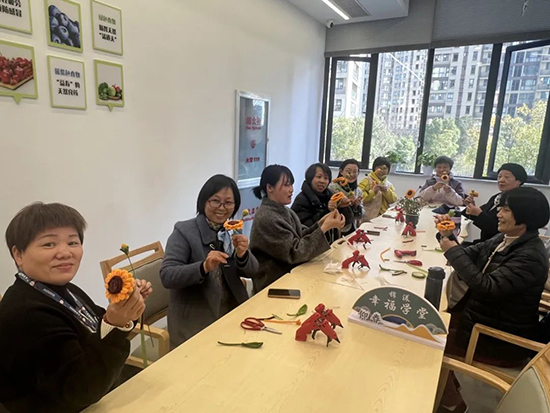 “先將扭扭棒對折,然后像這樣扭一扭,再彎一彎……”學員們認真聽講,仔細觀摩,一步步跟著老師的步驟進行操作。一根根普通的扭扭棒在學員們的手中仿佛被賦予了生命,逐漸變成了一片片花瓣、一朵朵鮮花。玫瑰、向日葵、郁金香……形態各異、色彩繽紛的扭扭棒花朵在學員們的手中綻放,活動現場充滿了歡聲笑語。